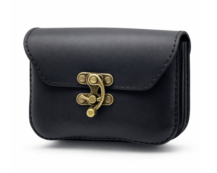 Fekete bőr övtáska, dupla fakkos, horgas csatos, fekvő