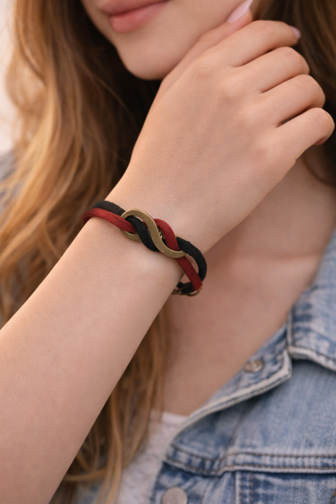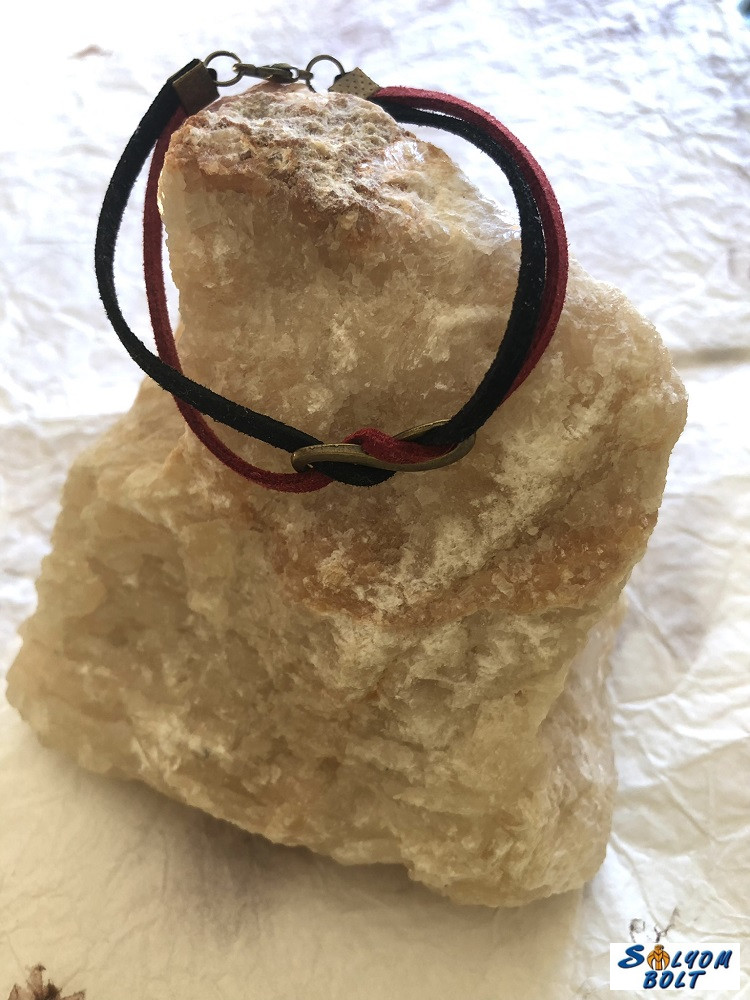Karkötő bordó-fekete bőrcsíkokkal és végtelen medállal