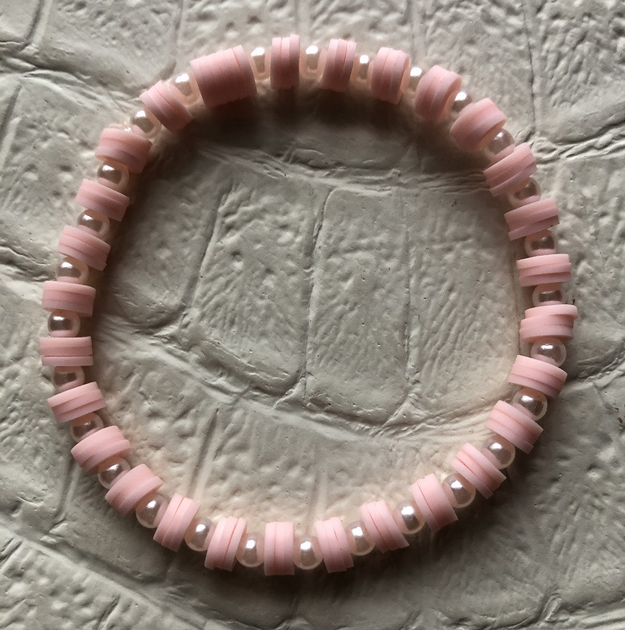 Ez a karkötő játékos, mégis nőies hangulatú a pasztell rózsaszín korong gyöngyök és az apró fehér gyöngyök váltakozásának köszönhetően.