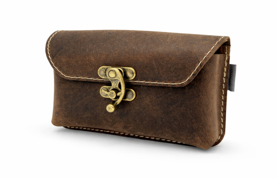 Telefontokos bőr övtáska, elején görbezárral, szélein díszvarrással, barna színben.