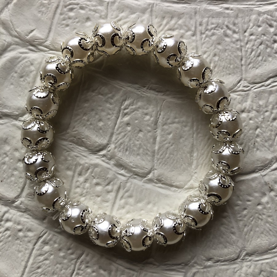 Ez a kézzel fűzött Tündöklő Gyöngyvarázs karkötő a klasszikus eleganciát ötvözi a modern részletgazdagsággal. Fényes, gyöngyhatású gyöngyeit ezüstszínű díszítő köztesek emelik ki, így tökéletes kiegészítő lehet esküvőre, ünnepi alkalmakra, vagy akár mindennapi viseletre is, ha egy kis luxust szeretnél a napodba csempészni. Rugalmas damilra van fűzve, így kényelmesen illeszkedik a legtöbb csuklóméretre.